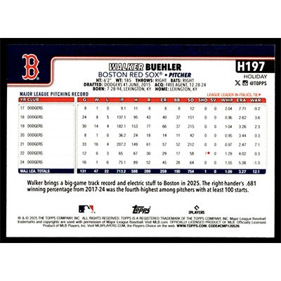This is a 2025 Topps Holiday Green Plaid Walker Buehler baseball card. The card is #H197 and pictures show condition.