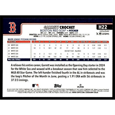This is a 2025 Topps Holiday Green Plaid Garrett Crochet baseball card. The card is #H22 and pictures show condition.