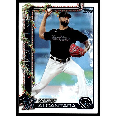 This is a 2025 Topps Holiday Sandy Alcantara baseball card. The card is #H144 and pictures show condition.