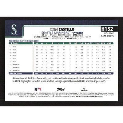 This is a 2025 Topps Holiday Luis Castillo baseball card. The card is #H152 and pictures show condition.