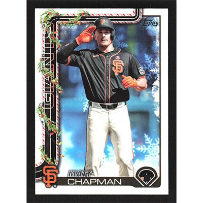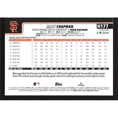 This is a 2025 Topps Holiday Matt Chapman baseball card. The card is #H177 and pictures show condition.