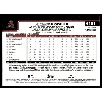 This is a 2025 Topps Holiday Adrian Del Castillo baseball card. The card is #H181 and pictures show condition. Team(s): Arizona Diamondbacks Rookie Card (RC)
