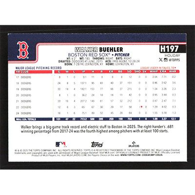 This is a 2025 Topps Holiday Walker Buehler baseball card. The card is #H197 and pictures show condition.