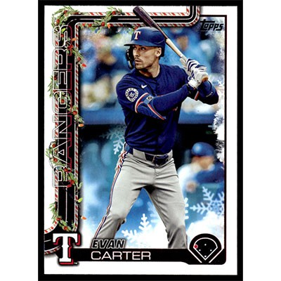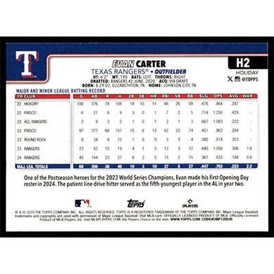 This is a 2025 Topps Holiday Evan Carter baseball card. The card is #H2 and pictures show condition.