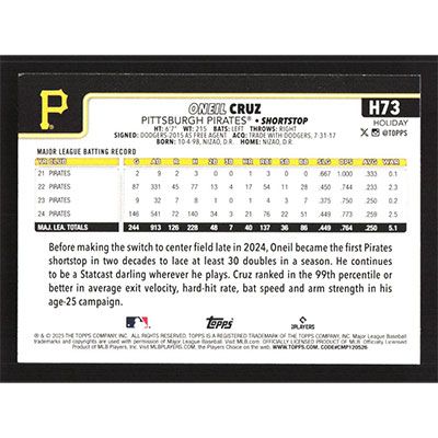 This is a 2025 Topps Holiday Oneil Cruz baseball card. The card is #H73 and pictures show condition.