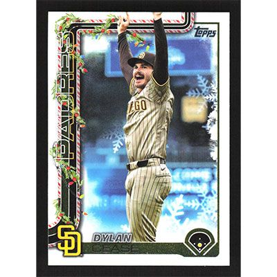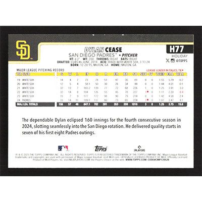 This is a 2025 Topps Holiday Dylan Cease baseball card. The card is #H77 and pictures show condition.
