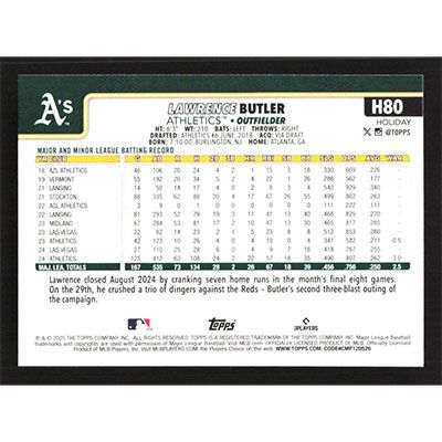 This is a 2025 Topps Holiday Lawrence Butler baseball card. The card is #H80 and pictures show condition.