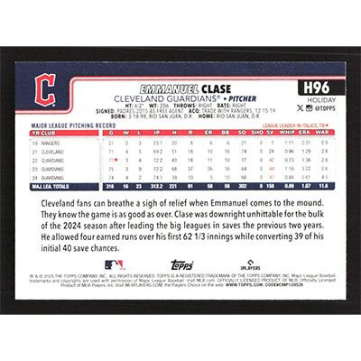 This is a 2025 Topps Holiday Emmanuel Clase baseball card. The card is #H96 and pictures show condition.