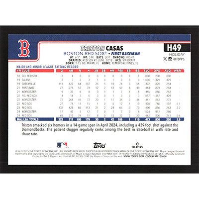 This is a 2025 Topps Holiday Light Blue Glitter Triston Casas baseball card. The card is #H49 and pictures show condition.