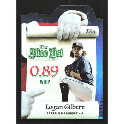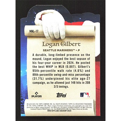 This is a 2025 Topps Holiday Making The Nice List Logan Gilbert baseball card. The card is #MNL-17 and pictures show condition. Team(s): Seattle Mariners