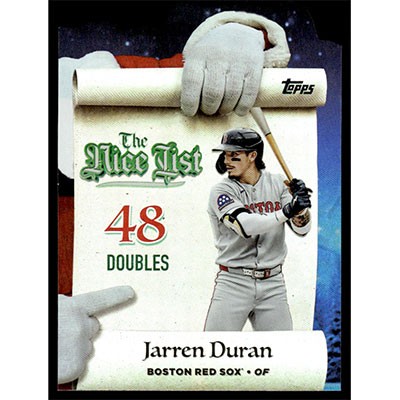 This is a 2025 Topps Holiday Making the Nice List Jarren Duran baseball card. The card is #MNL-24 and pictures show condition.