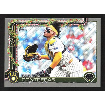 This is a 2025 Topps Holiday Silver Glitter William Contreras baseball card. The card is #H21 and pictures show condition.