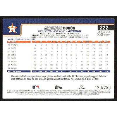 This is a 2025 Topps Purple Rainbow Foil Mauricio Dubon baseball card. The card is #222 and pictures show condition. This card is limited; #'d 120/250.