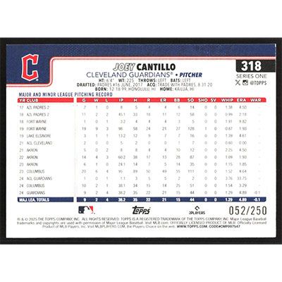 This is a 2025 Topps Purple Rainbow Foil Joey Cantillo baseball card. The card is #318 and pictures show condition. This card is limited; #'d 052/250. Team(s): Cleveland Guardians Rookie Card (RC)