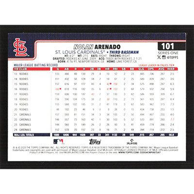 This is a 2025 Topps Rainbow Foil Nolan Arenado baseball card. The card is #101 and pictures show condition.