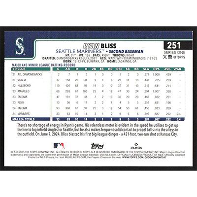 This is a 2025 Topps Rainbow Foil Ryan Bliss baseball card. The card is #251 and pictures show condition. Team(s): Seattle Mariners Rookie Card (RC)