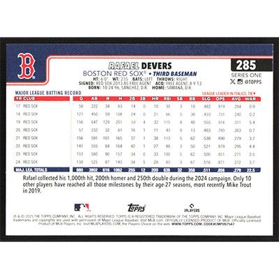 This is a 2025 Topps Rainbow Foil Rafael Devers baseball card. The card is #285 and pictures show condition.