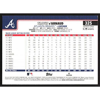 This is a 2025 Topps Rainbow Foil Travis d'Arnaud baseball card. The card is #325 and pictures show condition.