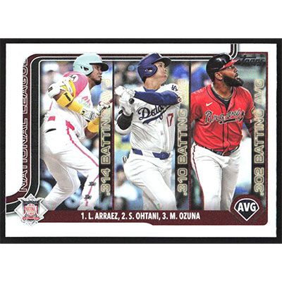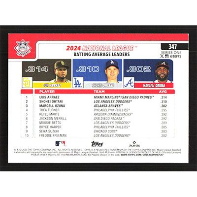 This is a 2025 Topps Rainbow Foil Luis Arraez, Shohei Ohtani and Marcell Ozuna League Leaders baseball card. The card is #347 and pictures show condition.