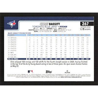 This is a 2025 Topps Sandglitter Chris Bassitt baseball card. The card is #267 and pictures show condition.