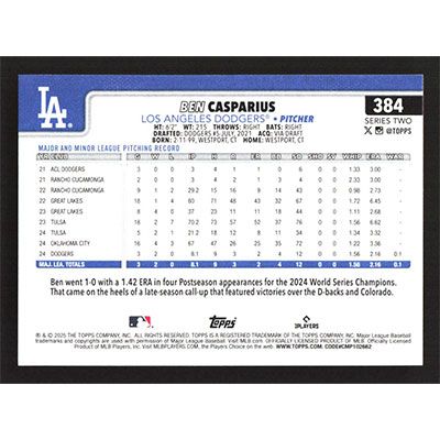 This is a 2025 Topps Sandglitter Ben Casparius baseball card. The card is #384 and pictures show condition. Team(s): Los Angeles Dodgers Rookie Card (RC)