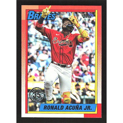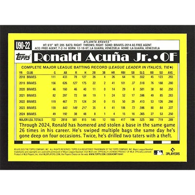 This is a 2025 Topps Update '90 Ronald Acuña Jr baseball card. The card is #U90-22 and pictures show condition.