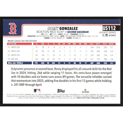 This is a 2025 Topps Update Diamante Foil Romy Gonzalez baseball card. The card is #US112 and pictures show condition.