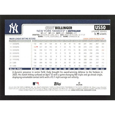 This is a 2025 Topps Update Pink Sandglitter Cody Bellinger baseball card. The card is #US50 and pictures show condition.