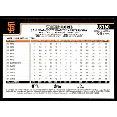This is a 2025 Topps Update Rainbow Foil Wilmer Flores baseball card. The card is #US160 and pictures show condition.