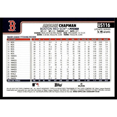 This is a 2025 Topps Update Aroldis Chapman baseball card. The card is #US116 and pictures show condition.