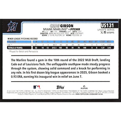 This is a 2025 Topps Update Cade Gibson baseball card. The card is #US131 and pictures show condition.