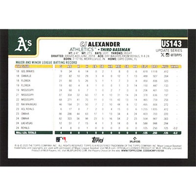 This is a 2025 Topps Update CJ Alexander baseball card. The card is #US143 and pictures show condition.