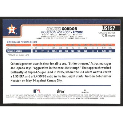 This is a 2025 Topps Update Colton Gordon baseball card. The card is #US157 and pictures show condition.