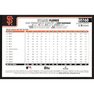 This is a 2025 Topps Update Wilmer Flores baseball card. The card is #US160 and pictures show condition.