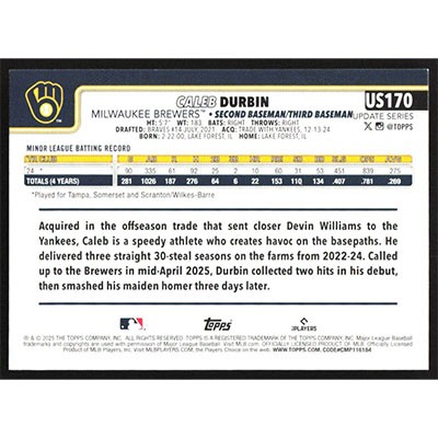 This is a 2025 Topps Update Caleb Durbin baseball card. The card is #US170 and pictures show condition. Team(s): Milwaukee Brewers Rookie Card (RC)