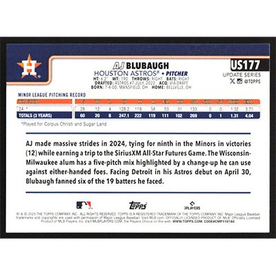 This is a 2025 Topps Update AJ Blubaugh baseball card. The card is #US177 and pictures show condition.