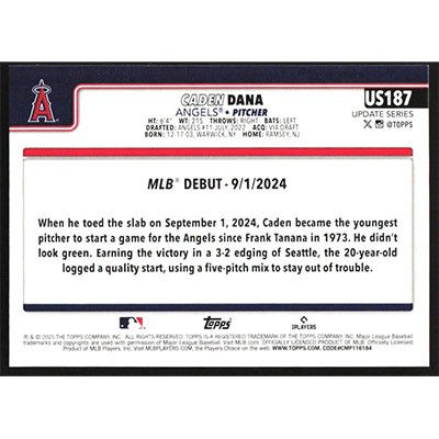 This is a 2025 Topps Update Caden Dana Rookie Debut baseball card. The card is #US187 and pictures show condition. Team(s): Los Angeles Angels Rookie Card (RC)