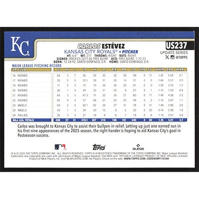 This is a 2025 Topps Update Carlos Estevez baseball card. The card is #US237 and pictures show condition.