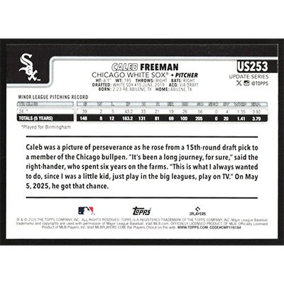 This is a 2025 Topps Update Caleb Freeman baseball card. The card is #US253 and pictures show condition. Team(s): Chicago White Sox Rookie Card (RC)