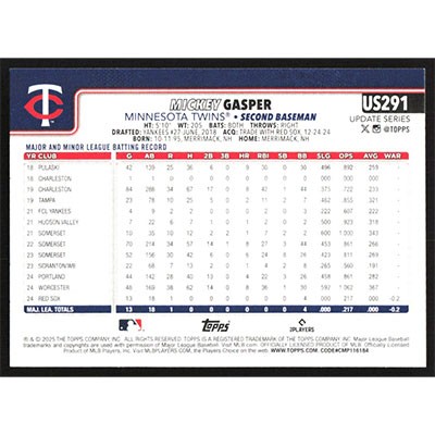 This is a 2025 Topps Update Mickey Gasper baseball card. The card is #US291 and pictures show condition.
