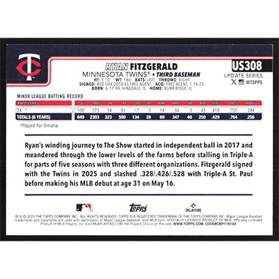 This is a 2025 Topps Update Ryan Fitzgerald baseball card. The card is #US308 and pictures show condition.