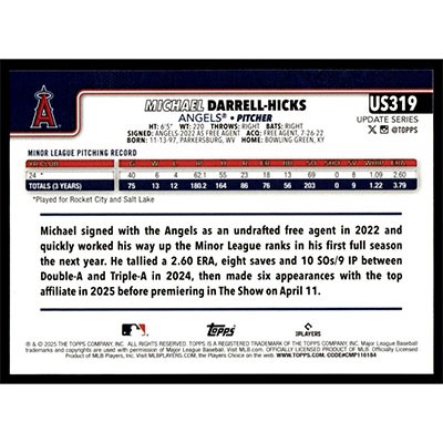 This is a 2025 Topps Update Michael Darrell-Hicks baseball card. The card is #US319 and pictures show condition. Team(s): Los Angeles Angels Rookie Card (RC)