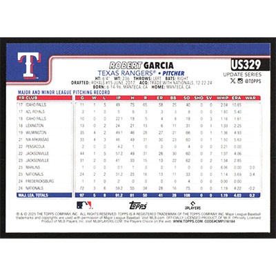 This is a 2025 Topps Update Robert Garcia baseball card. The card is #US329 and pictures show condition.