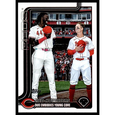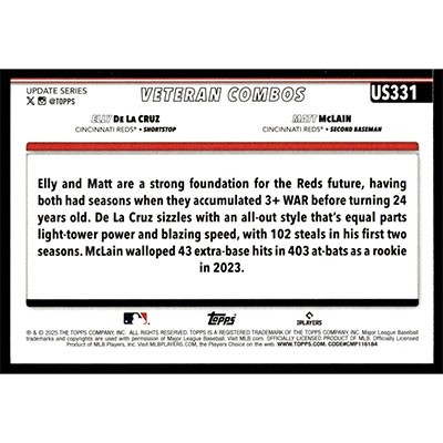 This is a 2025 Topps Update Elly De La Cruz and Matt McLain Veteran Combos Red-Hot Risers baseball card. The card is #US331 and pictures show condition.