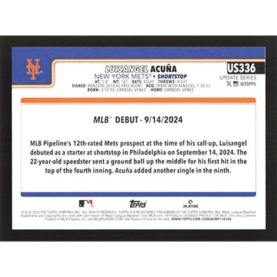 This is a 2025 Topps Update Luisangel Acuña Rookie Debut baseball card. The card is #US336 and pictures show condition. Team(s): New York Mets Rookie Card (RC)