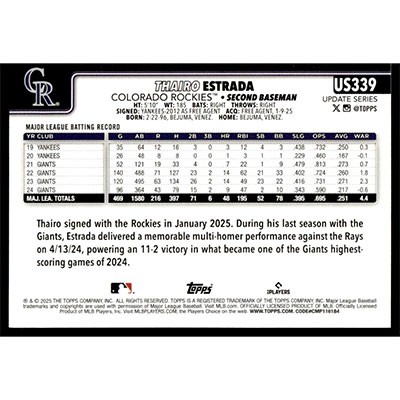 This is a 2025 Topps Update Thairo Estrada baseball card. The card is #US339 and pictures show condition.