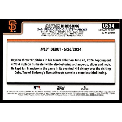 This is a 2025 Topps Update Hayden Birdsong Rookie Debut baseball card. The card is #US34 and pictures show condition. Team(s): San Francisco Giants Rookie Card (RC)