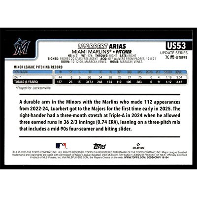 This is a 2025 Topps Update Luarbert Arias baseball card. The card is #US53 and pictures show condition.