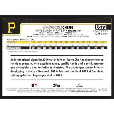 This is a 2025 Topps Update Tsung-Che Cheng baseball card. The card is #US72 and pictures show condition. Team(s): Pittsburgh Pirates Rookie Card (RC)