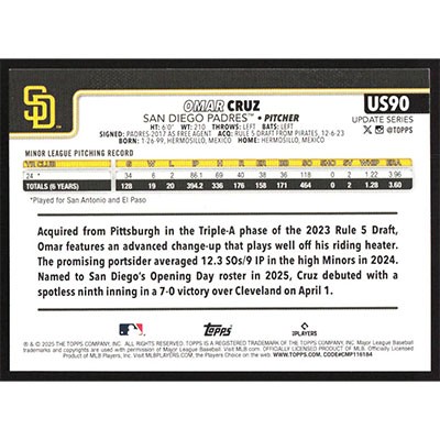 This is a 2025 Topps Update Omar Cruz baseball card. The card is #US90 and pictures show condition.
